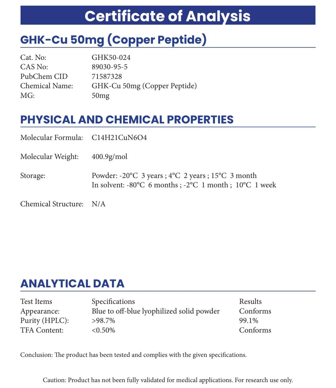 GHK-Cu is a natural peptide in human blood plasma, urine, and saliva. Research in animals reveals that GHK-Cu can improve wound healing, immune function, and skin health by stimulating collagen, fibroblasts and promoting blood vessel growth. There has been evidence that has shown that it acts as a feedback signal that is generated after tissue injury. It also suppresses free-radical damage and thus is a potent antioxidant.